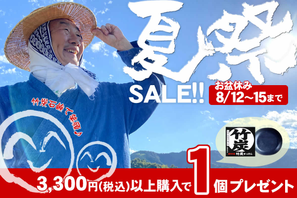「お盆休み特別企画♪夏祭りSALE!」では日頃ご愛顧いただいている皆様への感謝を込めて、竹炭石鹸で明るい気持ちと笑顔をお届けしたいと考えております。対象期間は2021年8月12日(木)〜8月15日(日)まで。プレゼントはお買い上げいただいた商品と一緒にお届けいたします。