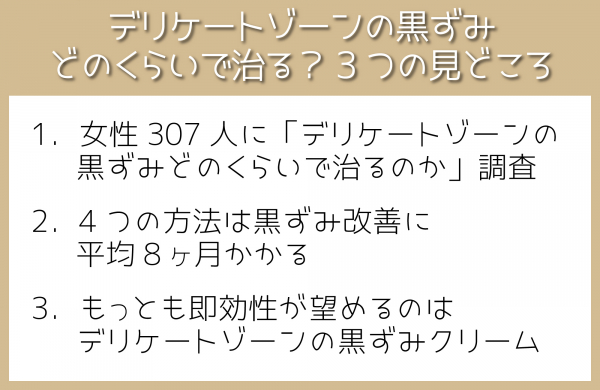 デリケートゾーンの黒ずみ何ヶ月くらいで治ったのかを調査した結果、3つの見どころがありました。