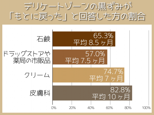 調査結果を元に、4つのケア別デリケートゾーンの黒ずみ改善期間を次にまとめます。()内は黒ずみが「もとに戻った」と回答した方の割合です。