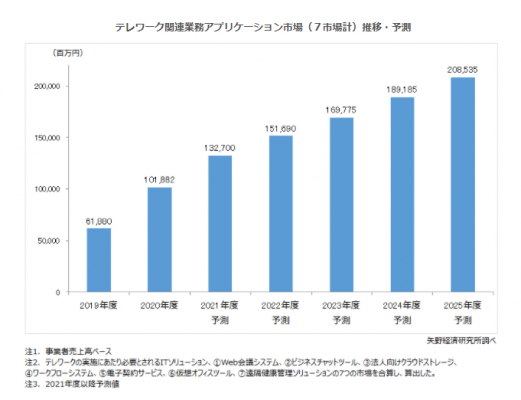 【矢野経済研究所プレスリリース】テレワーク関連業務アプリケーション市場に関する調査を実施(2021年)〜2020年度の国内テレワーク関連業務アプリケーション市場は前年度比64.6%増の1,019億円〜