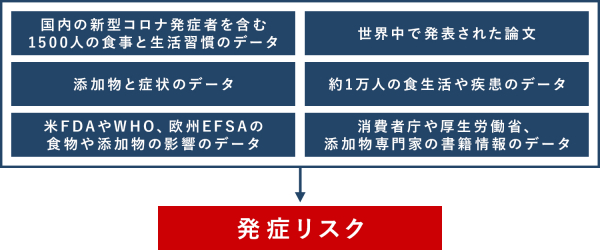 新型コロナに関しても分析を行った結果、特定の添加物や食材を摂っていると発症リスクが高まることや、運動、入浴などの生活習慣と発症リスクの関係が判明しました。さらにAIが前述の分析結果のほか、米FDAやWHO、EFSA、日本の消費者庁や厚生労働省が発表しているデータ、世界中から集めた論文、国内で独自に集めたデータを学習し、年齢や性別、BMI、既往症によるリスクなどの分析を行い、総合的に新型コロナを将来発症するリスク判定を行います。
