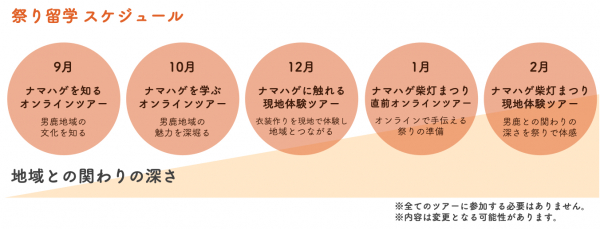 男鹿のなまはげを体験できるオンラインツアーの他、オフラインによる現地体験ツアーを通年で展開いたします。気軽なオンラインツアーからスタートし、地域との関りを深めながら現地に足を運ぶツアーを実施予定です。