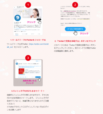・ご応募にはTwitterアカウントが必要です。ワールドトークのアカウントは、当選後に作成いただいても問題ございません。