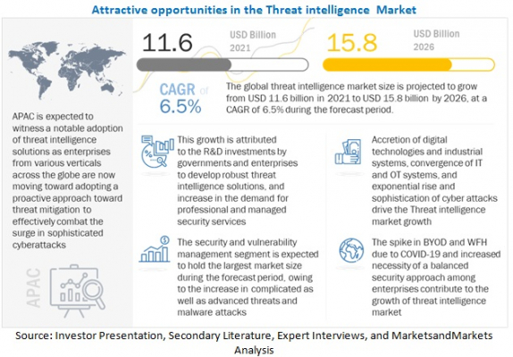 MarketsandMarketsはレポートの公開資料において、世界の脅威インテリジェンス市場は2021年に116億ドル、2026年までには158億ドルに達し、予測期間の年平均成長率(CAGR)は6.5%にになるとの予測結果を発表しました。