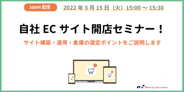 ECサイトの運営代行サービスを提供しているマーケティングアソシエーション株式会社(本社:東京都台東区 代表取締役:相内あゆ美、以下当社)は、2022年3月15日(火)に、ウェビナー「自社ECサイト開店セミナー!サイト構築・運用・倉庫の選定ポイントをご説明します」を開催いたします。