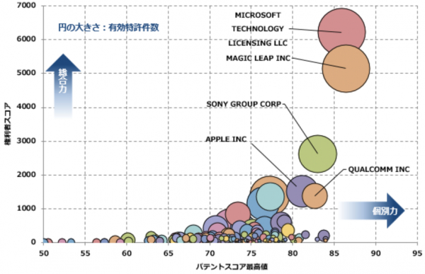 今回の調査では米国特許商標庁で公開されている「拡張現実(AR)/複合現実(MR)」技術について、個別特許の注目度を得点化する「パテントスコア」をベースに、特許の質と量から総合的に見た評価を行いました。