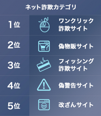 検知したサイトの内、ネット詐欺に関連するサイトを抽出し、独自のカテゴリに分類し上位順に表したものが以下で1位がワンクリック詐欺サイト、2位が偽物販サイト、3位がフィッシング詐欺サイトとなっております。なお、有害サイト(※3)や違法サイト(※4)は含まれておりません。