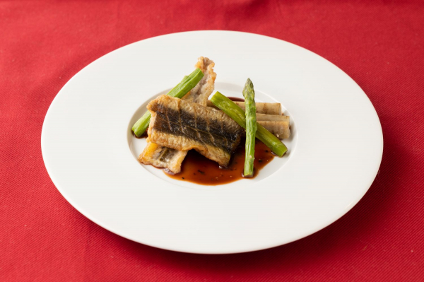 静岡県浜名湖産のふっくらとしたアナゴを丁寧にソテー。カルダモン、八角、赤ワインを煮詰めたフレンチ風スパイシーソースがアナゴの風味とマッチしています。