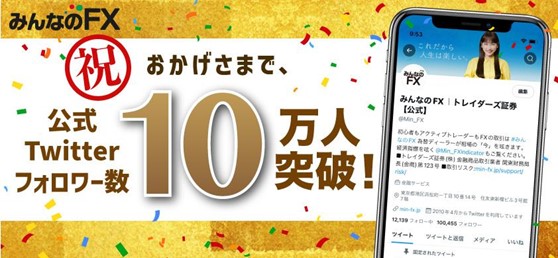 トレイダーズ証券は登録者10万人突破を記念し、4月28日より、「みんなのFX Twitterフォロワー10万人突破記念キャンペーン」を実施いたします。