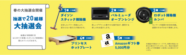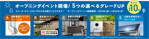 また、この5つの展示場同時オープンを記念して、人気の家電品などが当たる「春の大抽選会」と、住まいをグレードアップする5つのコースの中から好きなものが選べるイベントを、ウィザースホームの全営業所にて開催します。開催期間は、4月29日(金・祝)から5月31日(火)までとなっています。