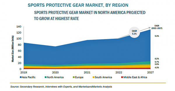スポーツ用保護具の市場規模は、2022年の53億米ドルからCAGR6.0%で成長し、2027年には71億米ドルに達すると予測されています。スポーツ用保護具市場は、健康やフィットネスに関する消費者の意識、国際的・国内的なスポーツイベントの増加といった要因により、近年拡大している市場です。さらに、世界中でスポーツやフィットネスに対する意識が高まっていることも、成長の要因として挙げられます。COVID-19の大流行以来、世界中の人々が健康的なライフスタイルを送ることの重要性を認識するようになり、フィットネスが多くの人々のトレンドとなり、スポーツ産業の人気につながっています。
