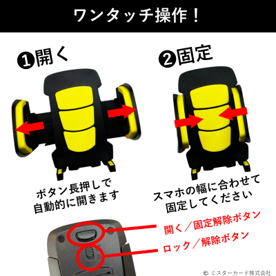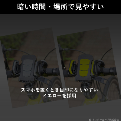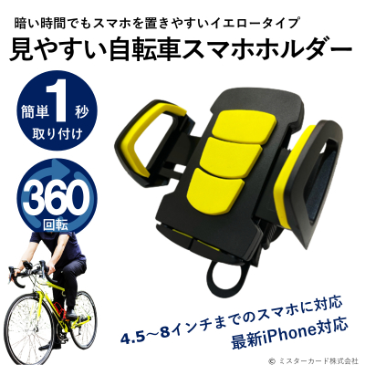 ミスターカード株式会社(本社所在地:埼玉県川口市)は、暗い時間や場所でもスマホを置きやすいイエロークッションが目印の「見やすい自転車ホルダー」を2022年9月16日(金)から発売いたします。誰でも簡単に自転車のハンドルにバンドで取り付けできて、ワンタッチ操作で開いてスマホを固定します。対応機種は、最大約11cmまでの幅に対応し、4.5〜8インチまでのスマホに対応。縦置き、横置きも可能な360度回転式を採用。夜間でも目立つ、イエロークッションでスマホを保護します。スマホを設置すればイエローは目立たちません。