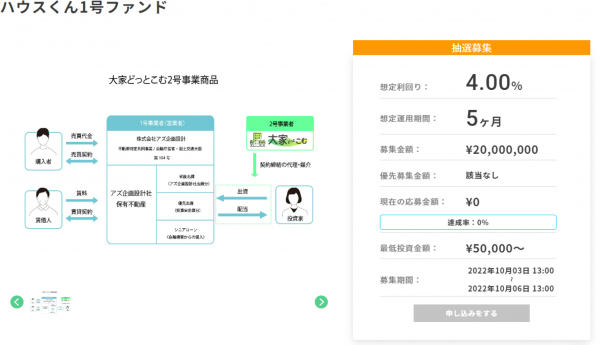 本案件は、不特法における1号事業者が当社、2号事業者がGBL社となり、「大家どっとこむ」の投資家向けのファンド組成(匿名組合型)となります。