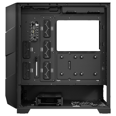 マザーボードベース背面に、6つのARGBファンを制御する専用のコントローラーを搭載しています。接続されたARGBファンは、ケーストップに備えられたLEDモードコントロールスイッチにより、色鮮やかなイルミネーションを連動して演出します。