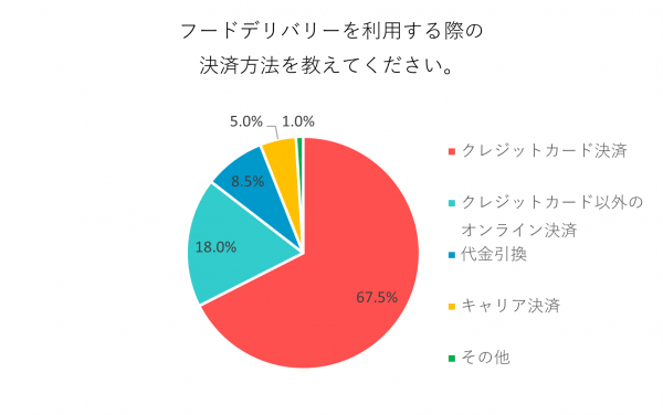 「クレジットカード決済」67.5%、「クレジットカード以外のオンライン決済」18%、「代金引換」8.5%、「キャリア決済」5%、「その他」2%という結果でした。