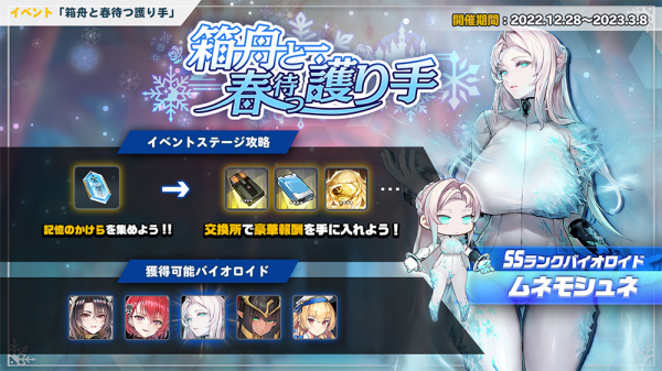 今回のアップデートで本編2.5部+後日談2部構成となるシナリオイベント「箱舟と春待つ護り手」の第2部が開催となりました!イベントアイテムを集めるとSSランクのバイオロイドなど豪華報酬と交換することができ、メインシナリオとは一味異なるスペシャルストーリーをお楽しみいただけますので是非この機会にプレイしてみてくださいね!!