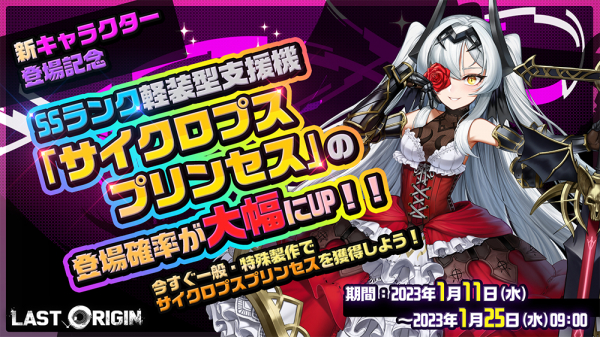 SSランク軽装型支援機「サイクロプスプリンセス」の登場を記念して、「製作確率UPキャンペーン」を開催いたします!下記の期間中、「工房」の「一般製作」や「特殊製作」にて「サイクロプスプリンセス」の出現確率が大幅にUPとなるのでこのチャンスをお見逃しなく!!