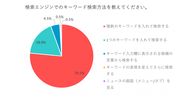 「複数のキーワードを入れて検索する」76.5%、「1つのキーワードを入れて検索する」18%、「キーワード入力欄に表示される候補の言葉から検索する」4.5%、「キーワードの表現を変えてさらに検索する」0.5%、「ニュースの画面(メニュー/タブ)を見る」0.5%という結果でした。