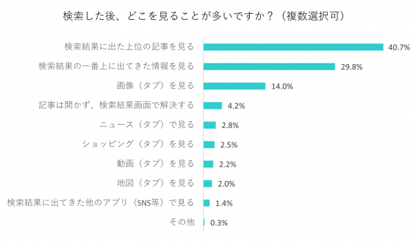 「検索結果に出た上位の記事を見る」40.7%、「検索結果の一番上に出てきた情報を見る」29.8%、「画像(タブ)を見る」14%、「記事は開かず、検索結果画面で解決する」4.2%、「ニュース(タブ)で見る」2.8%、「ショッピング(タブ)を見る」2.5%、「動画(タブ)を見る」2.2%、「地図(タブ)を見る」2%、「検索結果に出てきた他のアプリ(SNS等)で見る」1.4%、「その他」0.3%でした。