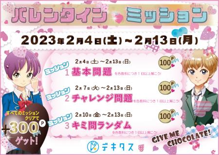 バレンタインはチョコレートに勉強プラス! オンライン学習教材「デキタス」が、2月4日より会員限定イベント『バレンタイン・ミッション』を実施します。