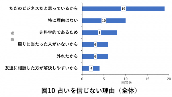 占いを信じない理由では、「ただのビジネスだと思っているから」という回答が回答数19と最も多く、次に「特に理由はない」という回答が多く寄せられていました。