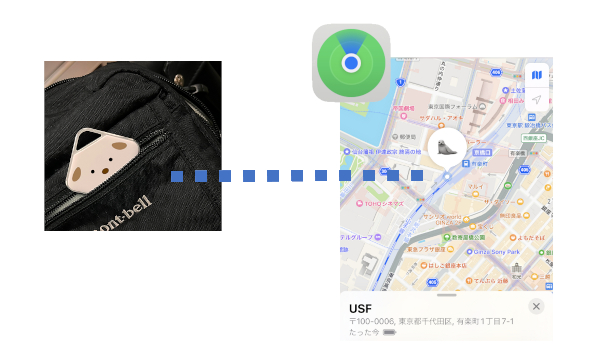 カバンや財布に入れたり、車のトレーに置くだけで iPhoneのApple Find My(探す)アプリからアイテムの場所をリアルタイムに確認することができます。