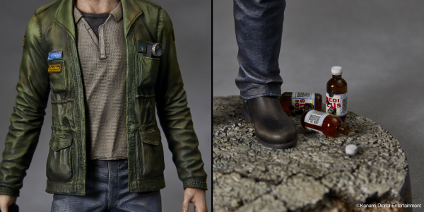 着古したミリタリージャケットは、ワッペンや胸ポケットに納められた懐中電灯の細部に至るまで精緻に再現。台座は市街地の行き止まりを再現しており、足元には体力回復に欠かせない栄養ドリンクが転がっている。