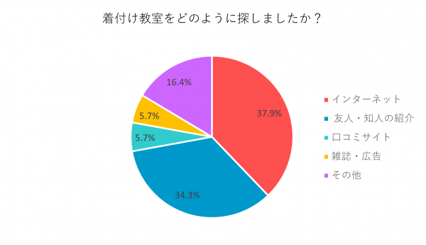 「インターネット」37.9%、「友人・知人の紹介」34.3%、「口コミサイト」「雑誌・広告」が同率で5.7%、「その他」16.4%でした。「その他」の回答では、「勤めていた会社で開催されていた」「着物店の店主が探してくれた」「散歩をしているときに見つけた」などがありました。