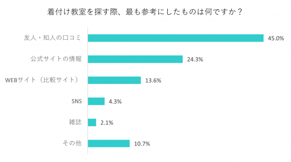今回実施したアンケート調査によると、着付け教室選びで参考にする情報は「友人・知人の口コミ」が45%と最多であることが明らかになりました。身近な人の口コミは受け入れやすいため、満足度の高い選択ができるようです。