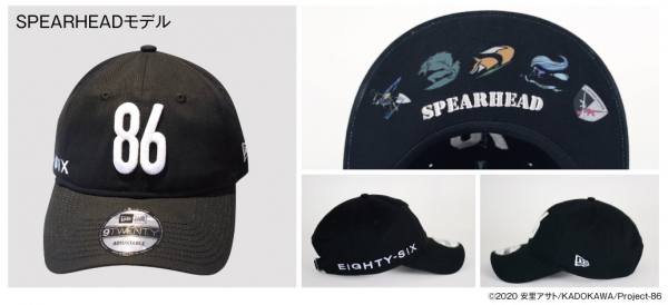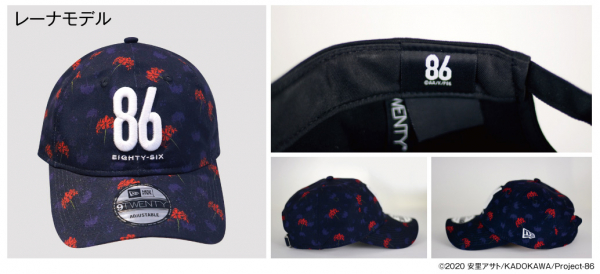 TYPEは「9TWENTYTM※3」。「SPEARHEADモデル」「レーナモデル」の2種類。「SPEARHEADモデル」はブラックカラーに『86』ロゴを厚盛り仕様にて正面に刺繍、向かって左サイドには「EIGHTY-SIX」ロゴを通常刺繍し、バイザー裏面にはSPEAHEAD戦隊各パーソナルマークをプリント及びSPEARHEADの文字を刺繍、『86』ロゴを刺繍したタグ付きのデザイン・仕様になっております。「レーナモデル」はネイビーカラーに『86』ロゴを厚盛り仕様+「EIGHTY-SIX」ロゴを通常仕様にて正面に刺繍、バイザー裏面含め全体に「彼岸花デザイン」をプリント加工、『86』ロゴを刺繍したタグ付きのデザイン・仕様となっております。