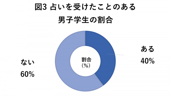 結果、これまで占いを受けたことがある男子学生(40%)よりも受けたことがない男子学生(60%)の方が割合的に高いことが明らかとなりました。