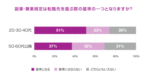 転職先を検討する際に「副業・兼業」が認められていることが企業選定の基準となりえるのかという質問では、20・30・40代の会社員51%が基準になると回答、基準とはならないとの回答は23%でした。50・60代以降の会社員は37%が基準となりえると回答、基準とはならないとの回答は32%でした。年代により傾向はあるものの、多くの会社員は「副業・兼業」を前向きにとらえており、転職を検討する材料にしていることがうかがえます。