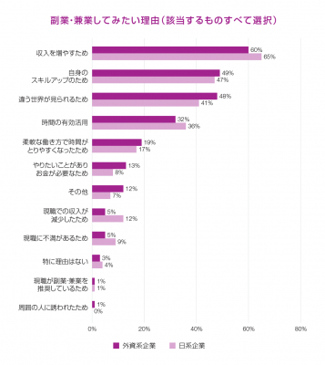 上記の結果を考慮しつつ、なぜ「副業・兼業」をしてみたいのかの理由をみると、外資系企業勤務会社員は、1位「収入を増やすため」(60%)、2位「自身のスキルアップのため」(49%)、3位「違う世界が見られるため」(48%)。日系企業勤務会社員も外資系企業勤務会社員と順位に変化はなかった、1位「収入を増やすため」(65%)、2位「自身のスキルアップのため」(47%)、3位「違う世界が見られるため」(41%)。