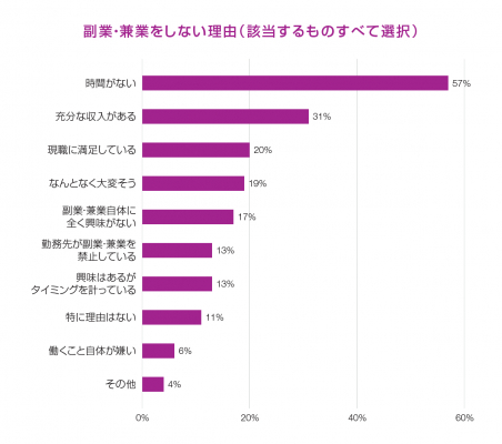 「副業・兼業」に興味がないと回答した会社員は、「副業・兼業」をしない理由として、1位「時間がない」(57%)、2位「充分な収入がある」(31%)、3位「現職に満足している」(20%)を挙げました。