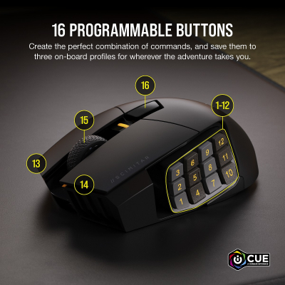 SCIMITAR ELITE WIRELESSは、26,000 DPIに対応したワイヤレスゲーミングマウスです。12個のサイドボタンを含め、合計で16個のプログラマブルボタンを搭載し、1 DPI刻みで調整が可能な独自のCORSAIR MARKSMANセンサーと、2000 Hzの高速ポーリングレートを実現するSLIPSTREAMワイヤレステクノロジーにより、抜群の反応速度と高精度を両立します。