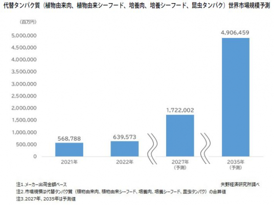 こうしたなか、2027年の代替タンパク質の世界市場規模(植物由来肉、植物由来シーフード、培養肉、培養シーフード、昆虫タンパク計)はメーカー出荷金額ベースで、1兆7,220億200万円を予測する。また、その後も拡大基調で推移し、2035年には4兆9,064億5,900万円になるものと予測する。