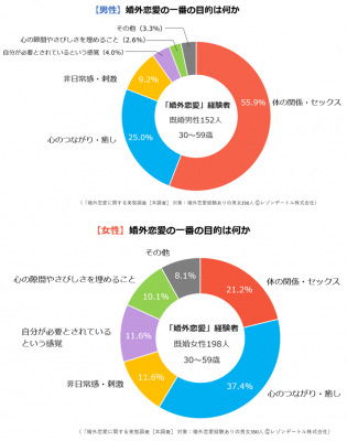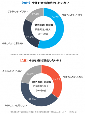今回の第4報では「婚外恋愛経験者」の既婚男女350人に「体の関係の有無」「婚外恋愛の目的」「妻・夫への罪悪感の有無」「婚外恋愛は人生のプラスになったか」「今後も婚外恋愛をしたいと思うか」などを尋ねた結果を分析します。