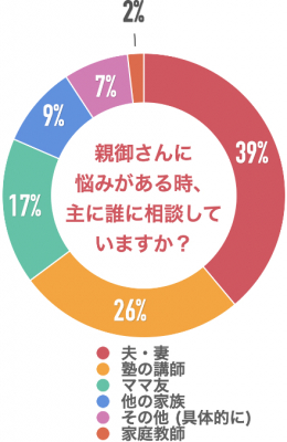 「夫・妻」が39%、「塾の講師」が26%、「ママ友」が17%、「他の家族」が9%、「その他(具体的に)」が7%、「家庭教師」が2%、という結果となりました。