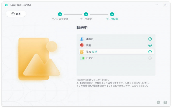 step3:選択したデータは対象のデバイスに転送されています。転送中は接続を切らないでください。以下の画面が表示されたら、すべてのデータが正常に転送されました!