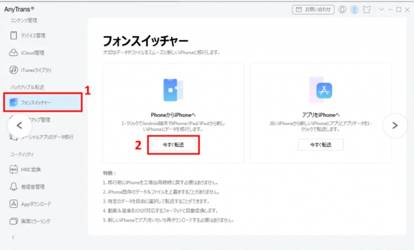 Step1. AnyTrans を無料でダウンロードしてパソコンにインストールします 。両方のiPhoneをコンピュータに接続 します。フォンスイッチャー機能をクリックしてAppsかからiPhoneへオプションを選択します。