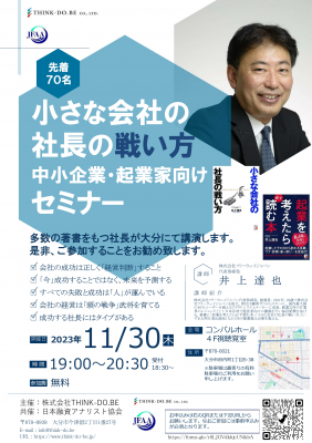 経営コンサルティング会社である株式会社THINK-DO.BE(大分県大分市、代表取締役:松田志朗)は、日本融資アナリスト協会と共催で、2023年11月30日(木)19:00より大分市コンパルホールにて井上達也氏をお招きし、「小さな会社の社長の戦い方 中小企業・起業家向けセミナー」を開催します。