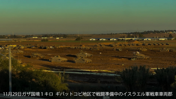 同地区では、数百台と思われるイスラエル軍の戦車が列をなし、攻撃に備えている様子が伺える。