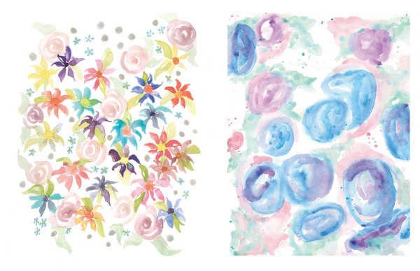 水彩タッチのペイントが描かれたページに、自由な感性で線を描き入れてアートを完成させます。