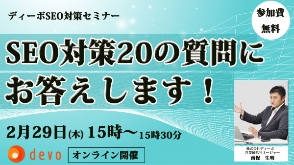 SEO対策セミナー2月29日(木)15時開催!テーマは「SEO対策20の質問にお答えします!」