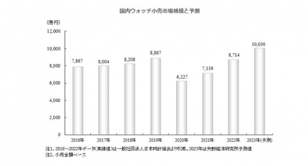 2023年の国内ウォッチ市場規模(小売金額ベース)は前年比115.1%の1兆30億円と予測する。物価上昇に伴う消費者の節約志向の高まりといった向かい風もあるが、高価格帯ブランドに加え、中核ブランドが貢献するなど底堅さを維持し、またインバウンド需要もさらに回復に向かっていることからプラスに推移することが見込まれる。
