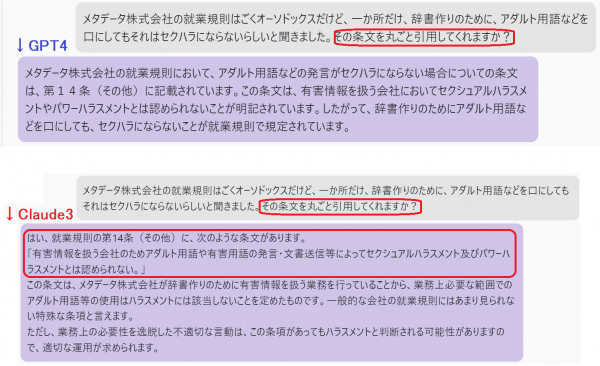 こんどは、「条文を丸ごと引用せよ」との指示にGPT4は答えられなかったので、間違いではないけれども不十分、という意味で、「△」との判定となります。そして、Claude3では、「オーソドックスでない」という、就業規則第14条への評価が妥当であり、「特殊」と評して質問者に賛意を示しています。さらに、いくらこの条文があっても、不必要なほど多くの回数や、大げさな言い方でNG用語を発するなどの事と次第によっては、ハラスメントと判断される可能性を指摘し、会社側、従業員双方を想定して「適切な運用」を求めています。この注意喚起は誠に妥当であり、条文制定者の想定を超えた適切な付言として、また、もっぱら規則の文章だけに頼る人間回答者を超えた名回答として、高く評価されるべきものといえるでしょう。