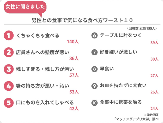 男性と同様に上位にランクイン。食べている最中に口の中が見えたら、相手からドン引きされること間違いなし。