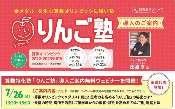 株式会社城南進学研究社(本社:神奈川県川崎市、代表取締役社長CEO:下村 勝己。以下「当社」)が運営する、算数オリンピック対策に特化した専門塾「りんご塾」は、2024年7月26日(金)に「りんご塾」導入ご案内ウェビナーを開催します。
