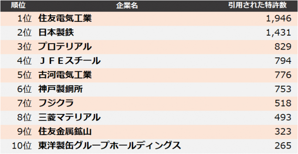 集計の結果、2023年に最も引用された企業は、1位 住友電気工業、2位 日本製鉄、3位 プロテリアルとなりました。