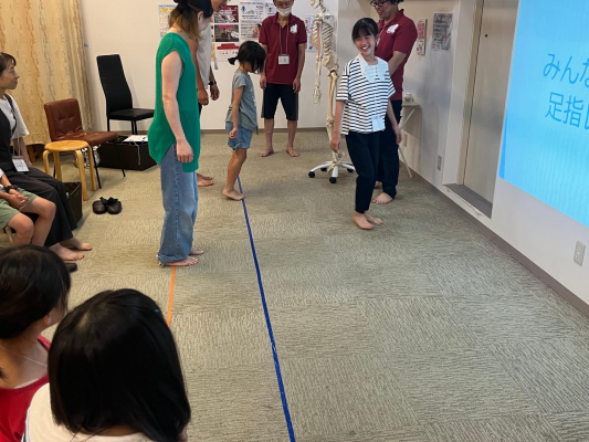 「足を整えると体がこんなに動かせる!」というテーマのもと、足の指を正しく使うことがいかに大切かを解説しました。浮き指や後ろ重心が引き起こす問題点を説明し、正しい重心の取り方やセルフケアの方法を参加者に実践していただきました。参加した親子が一緒に取り組んだ「あしゆび競争」では、足指の重要性を楽しく学び、親子のコミュニケーションを深める機会となりました。
